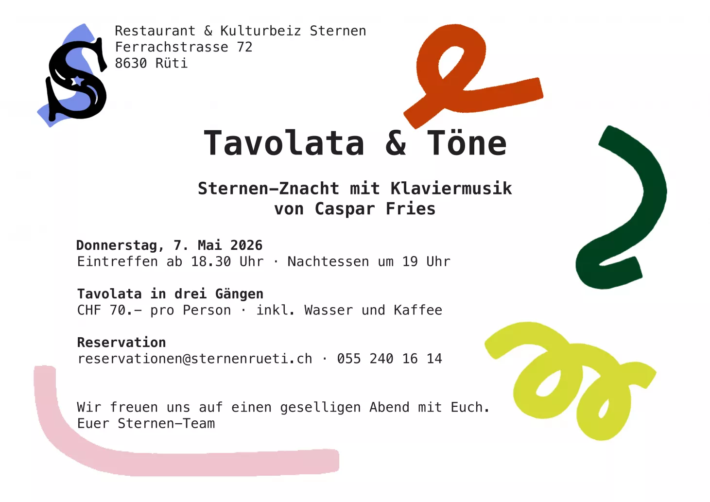 Reservation per E-Mail, Reservationsformular oder Tel. 055 240 16 14